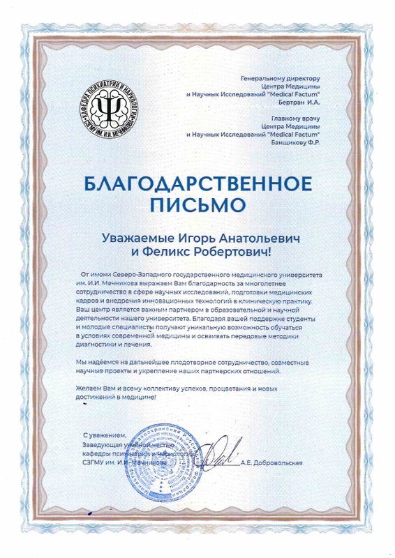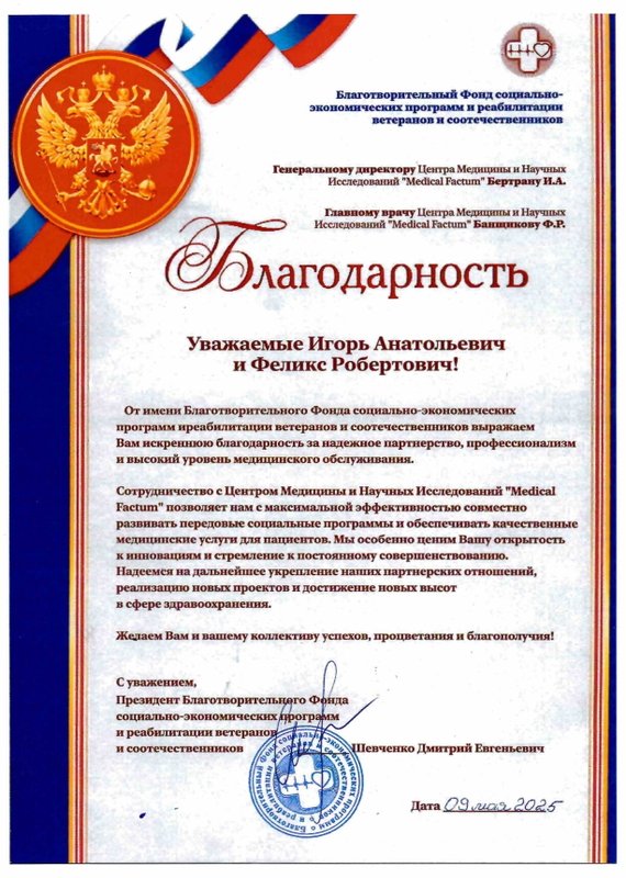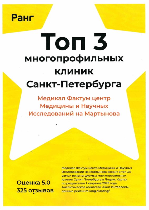 Центр медицины и научных исследований Медикал Фактум - это многопрофильное медицинское учреждение, предлагающее индивидуальный комплекс услуг для каждого клиента. В клинике всё организовано с учетом комфортного пребывания посетителей. Новейшее оборудование центра помогает провести диагностические исследования организма пациента для составления программы лечения и профилактических мероприятий. В клинике функционируют отделения психиатрии, общей терапии, кардиологии, аллергологии, нефрологии, неврологии, эндокринологии, дерматологии, венерологии, урологии, андрологии, гинекологии, психотерапии, наркологии, педиатрии, логопедии. Наши врачи имеют высокую квалификацию и с пониманием отнесутся к вашим проблемам. Доверяя свое здоровье нам, вы можете быть уверены в результате. Также мы поможем с составлением диеты и коррекцией веса.